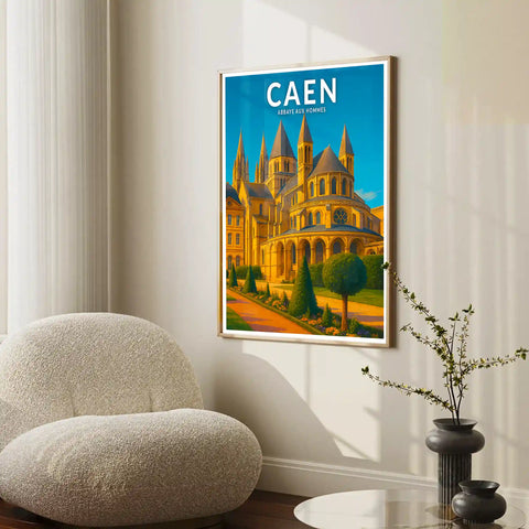 Cette affiche capture la solennité des pierres blondes sous le ciel normand et la rigueur symétrique des tours qui dominent la ville, imposant une atmosphère monastique. L’Abbaye aux Hommes représente un repère historique majeur pour les Caennais, à la fois symbole de patrimoine religieux et témoin du passé ducal de la Normandie.