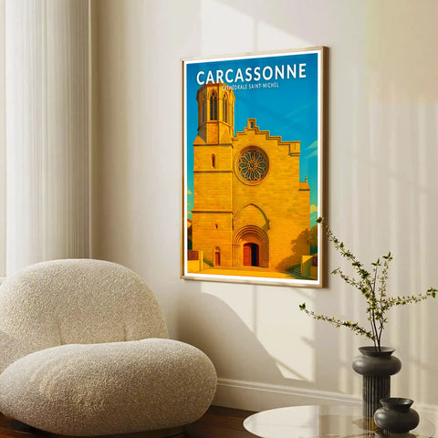 Cette affiche met en lumière la façade sobre encadrée de contreforts massifs et la silhouette haute et rectiligne dominant la ville basse, instaurant une atmosphère stable et solennelle. La Cathédrale Saint-Michel représente un exemple typique du gothique méridional, ancré dans la trame urbaine de Carcassonne.