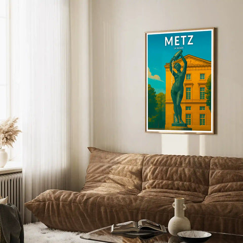 Cette affiche met en lumière la silhouette élancée de la figure féminine en bronze et la pureté du jet d’eau émergeant du bassin en pierre claire, instaurant une atmosphère délicate et structurée. La Naïade de Metz constitue un repère discret mais familier, apprécié pour sa finesse et sa présence apaisante en cœur de ville.