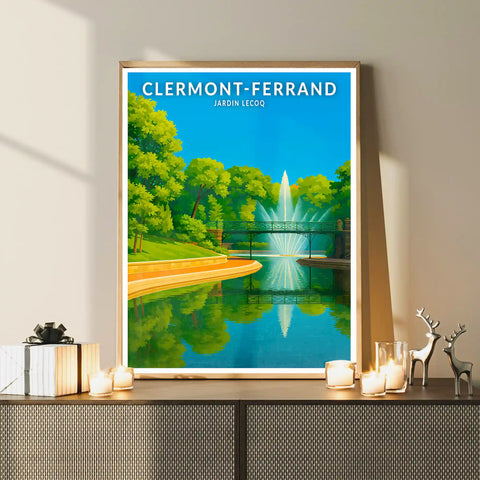 Cette affiche révèle les allées sinueuses bordées de massifs fleuris soigneusement taillés et les reflets paisibles du bassin central sous les frondaisons, composant une atmosphère ordonnée et apaisante. Le Jardin Lecoq est un lieu apprécié des Clermontois, espace de promenade et de détente intégré au rythme urbain.